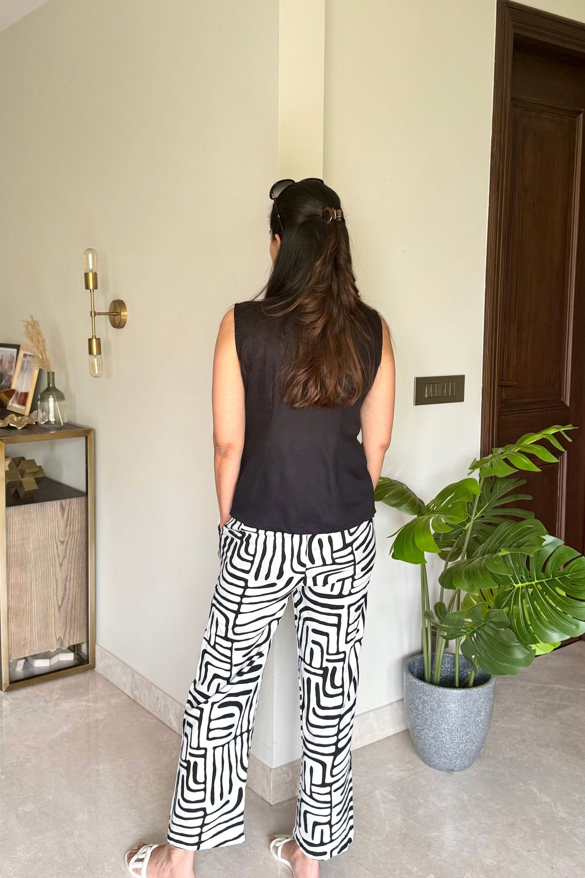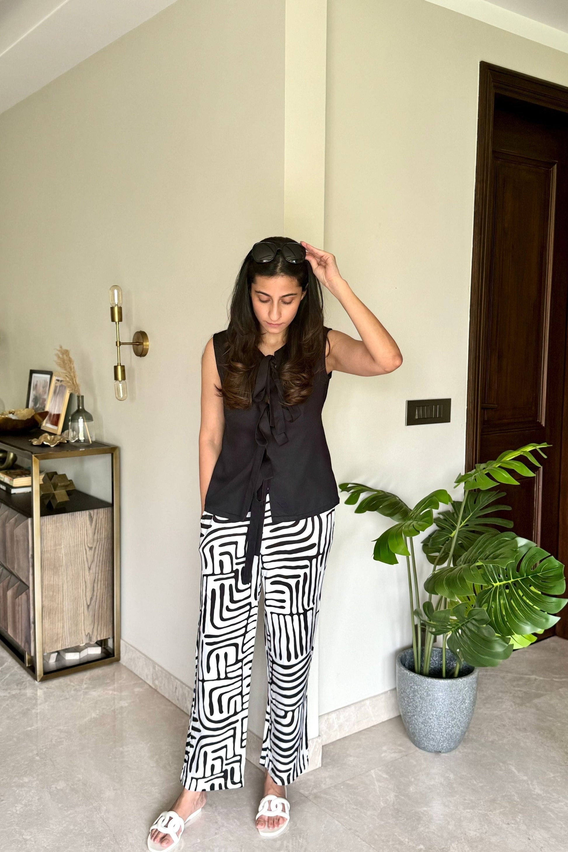 Made from a super light weight and breathable fabric, this coordinated set will keep you comfortable while looking chic. The top has ties in the front and the pants have 2 pockets