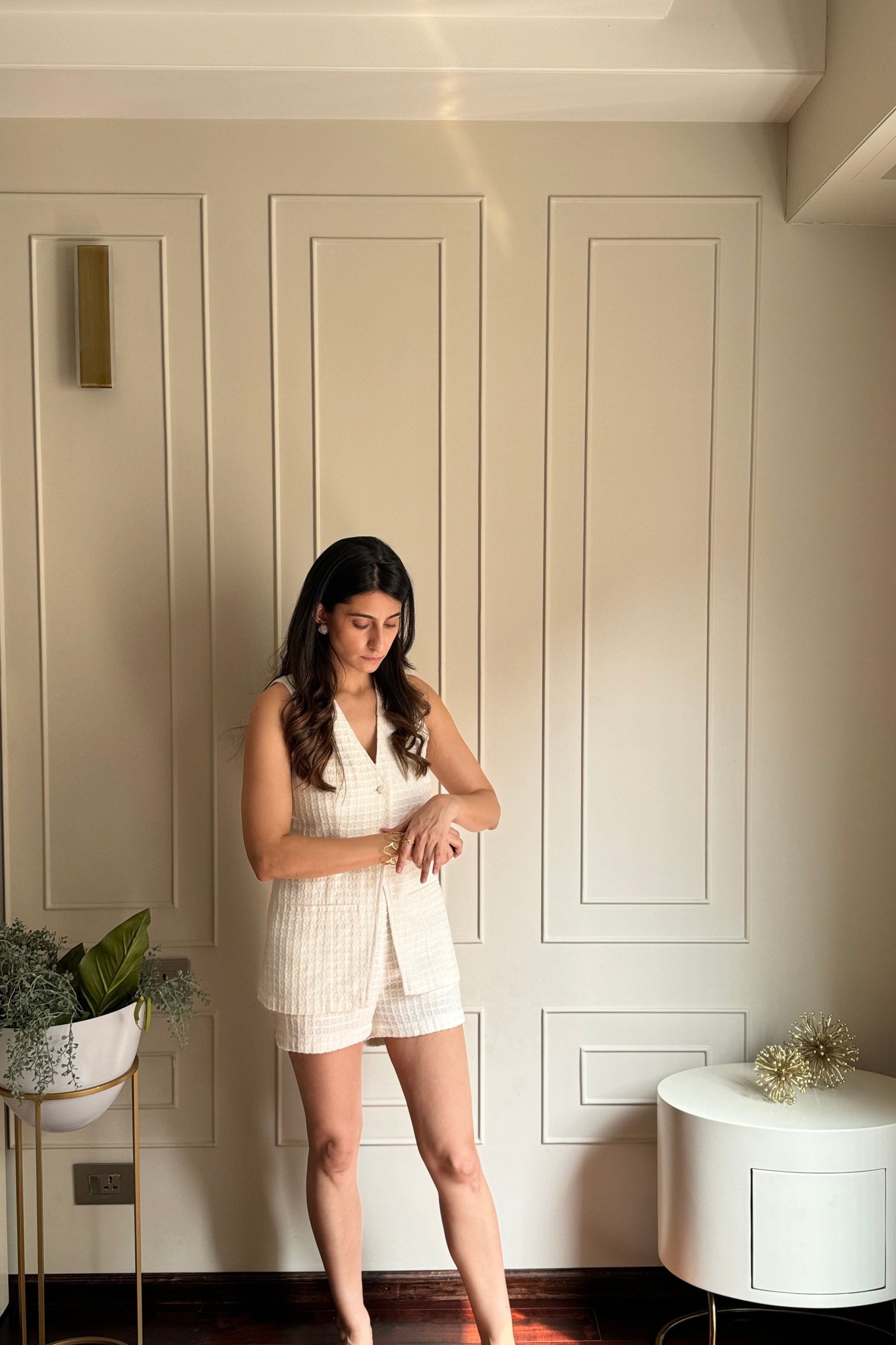 This white cotton set with threadwork is the perfect not so basic basic waistcoat set.